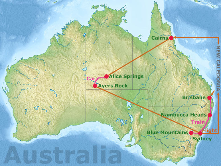 Coming from New Caledonia, I started in Brisbane and went to Sydney via Nambucca Heads. We met in Sydney, went to New Caledonia again, and returned to Cairns. From Cairns, we drove to Magnetic island. Afterwards, we flew to Alice Springs in the Red Centre, drove to Ayer's Rock, and flew back to Sydney.