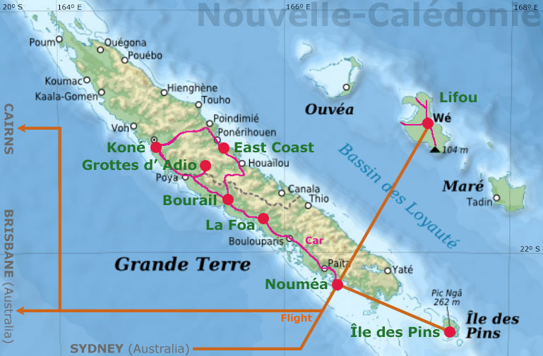 Nouvelle-Calédonie (engl. New Caledonia) is an island group ca. 1500 km off the northeast coast of Australia. Mountains run the entire length of the main island Grande Terre. On the western side the land is relatively flat, while the east coast is more mountainous. The capital of the territory associated with France is Nouméa. About 50 km southeastwards lies Île des Pins (Kunyie). The Îles Loyauté (Loyalty Islands) are east of Grande Terre, the main islands being Ouvéa, Lifou, and Maré.